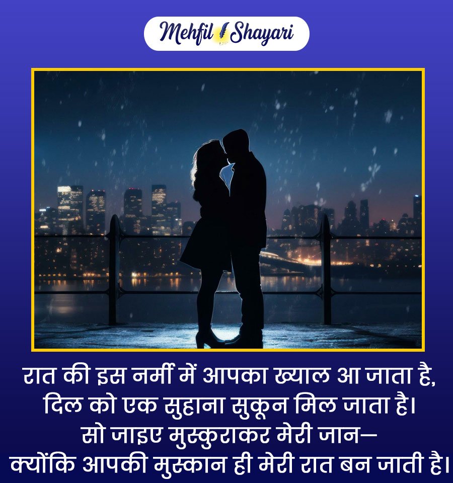 रात का समय दिल में छिपी भावनाओं को व्यक्त करने का सबसे खूबसूरत पल होता है, खासकर तब जब कोई आपके लिए बेहद खास हो। अपने प्यार को यह जताने का सबसे मधुर तरीका है कि दिन खत्म होने पर भी उनके बारे में आपके ख्याल रुकते नहीं। ये शायरियाँ दिल की कोमल भावनाओं को शब्दों में पिरोती हैं और रात को और भी खूबसूरत बना देती हैं।