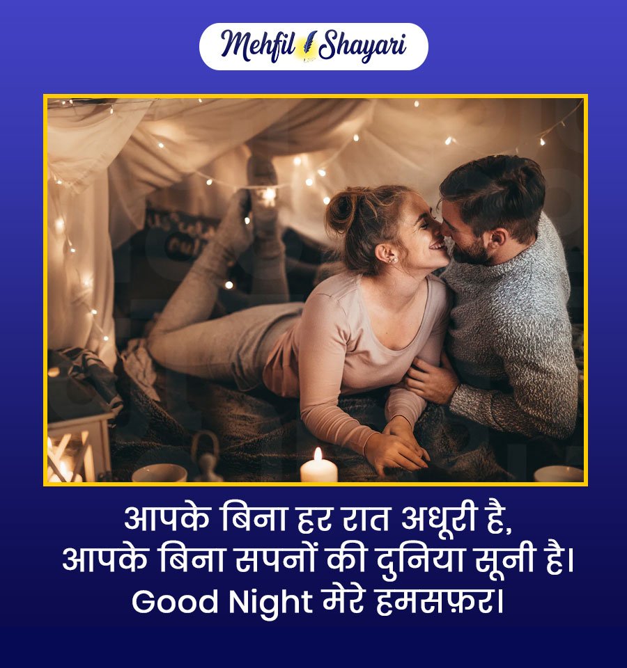अगर आप अपनी मोहब्बत, अपने हमसफ़र या अपने किसी स्पेशल पर्सन को प्यार भरी भेजना चाहते हैं, तो यहाँ आपके लिए 30+ दिल छू लेने वाली Romantic Good Night Shayari in Hindi दी जा रही हैं। इन शायरियों से आपकी रात भी मीठी होगी और उनके सपने भी।
