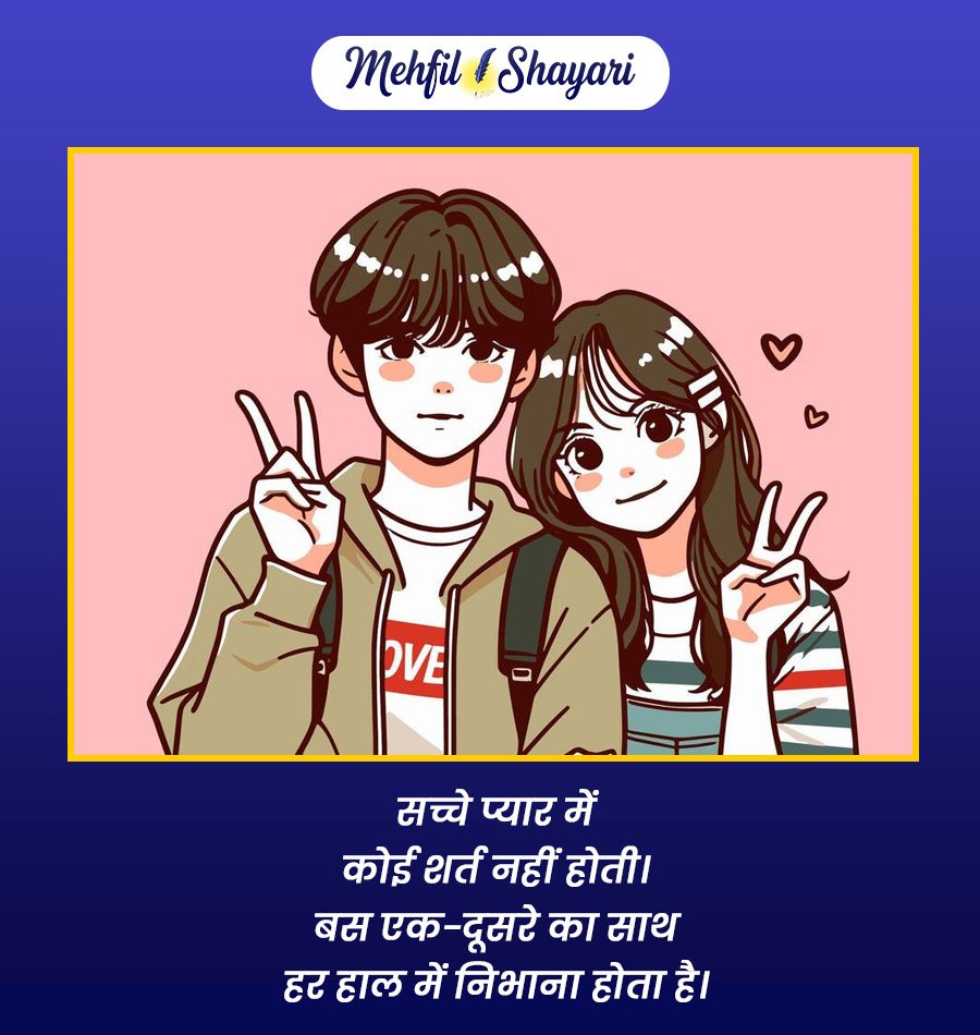सच्चा प्यार सिर्फ़ दो दिलों का मिलना नहीं, बल्कि एक-दूसरे की भावनाओं को समझना, साथ निभाना और हर हालत में एक-दूसरे के लिए खड़ा रहने का नाम है। ये रिश्ता विश्वास, सम्मान और दिल की गहराई में छिपी उस मोहब्बत से बना होता है, जो वक्त के साथ और मजबूत होती जाती है। true love shayari in hindi उन शब्दों का रूप है जो दिल से निकले हों और सीधे दिल को छू जाएँ।